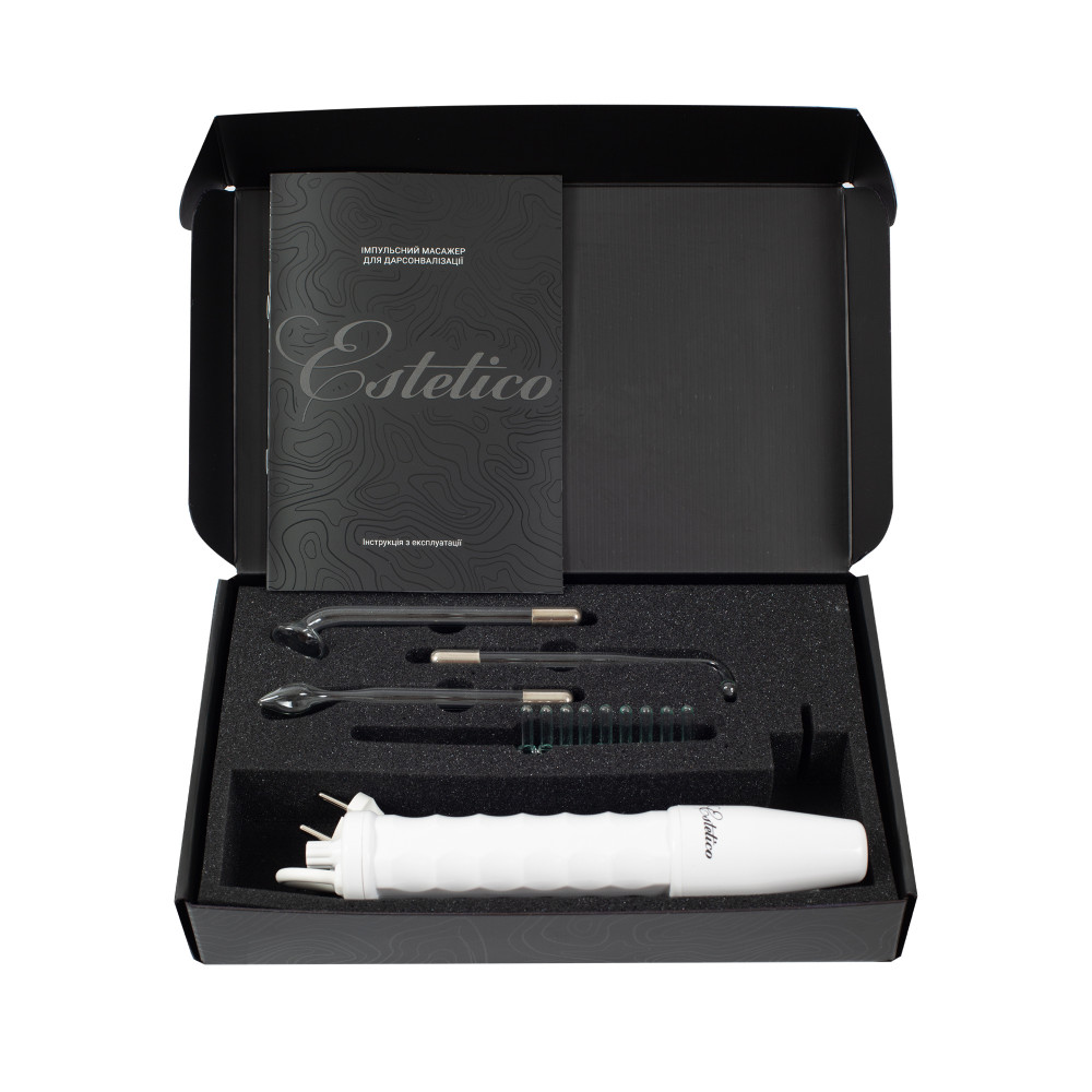 Дарсонваль Classic Estetico - 1 шт. Скляні газонаповнені електроди: - 4 шт. Контактний - 1 шт. Крапля - 1 шт. Гребінець - 1 шт. Пелюсток - 1 шт. Коробка для зберігання з протиударним ложементом серії Super Protection - 1 шт. Інструкція по експлуатації - 1 шт.